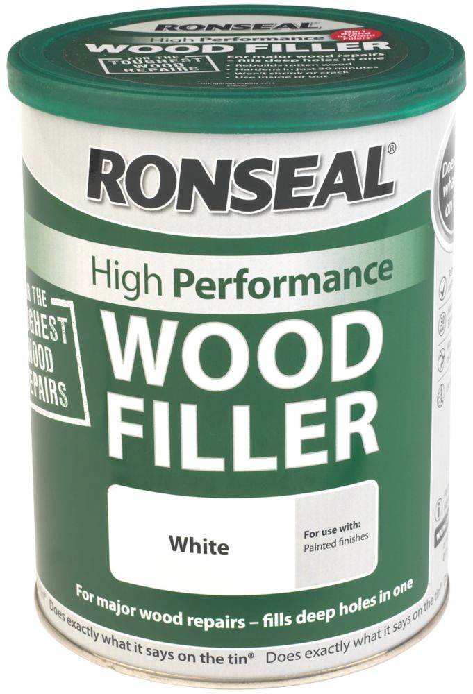 The ronseal high performance wood filler is a two part resin based system that s suitable for exterior and interior wood or the ronseal multipurpose wood filler can be sanded stained varnished or painted.