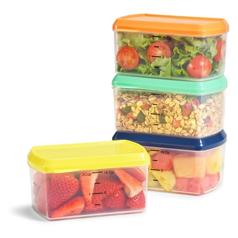 Food storage containers in a variety of sizes have updated more durable lids in a bright color.