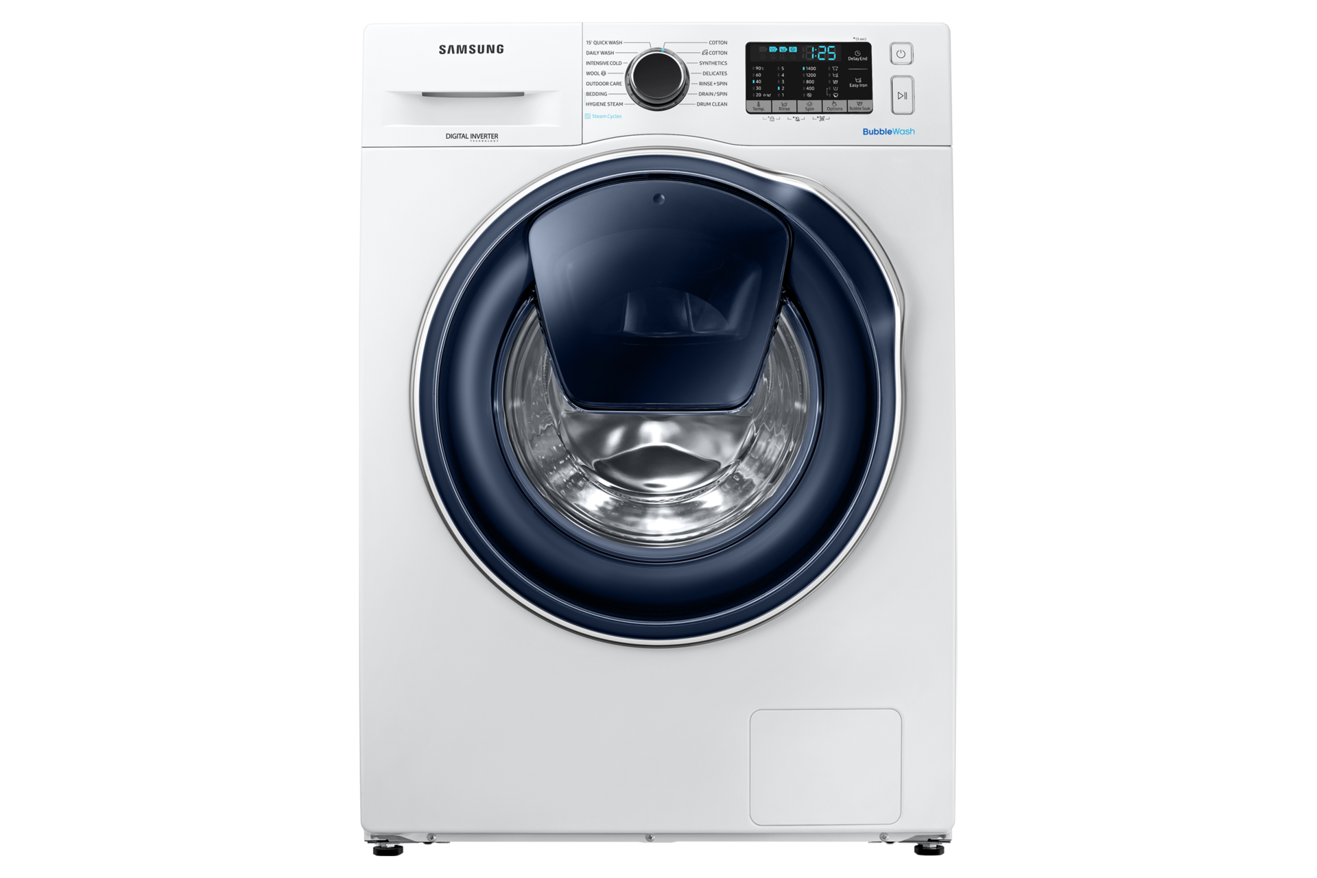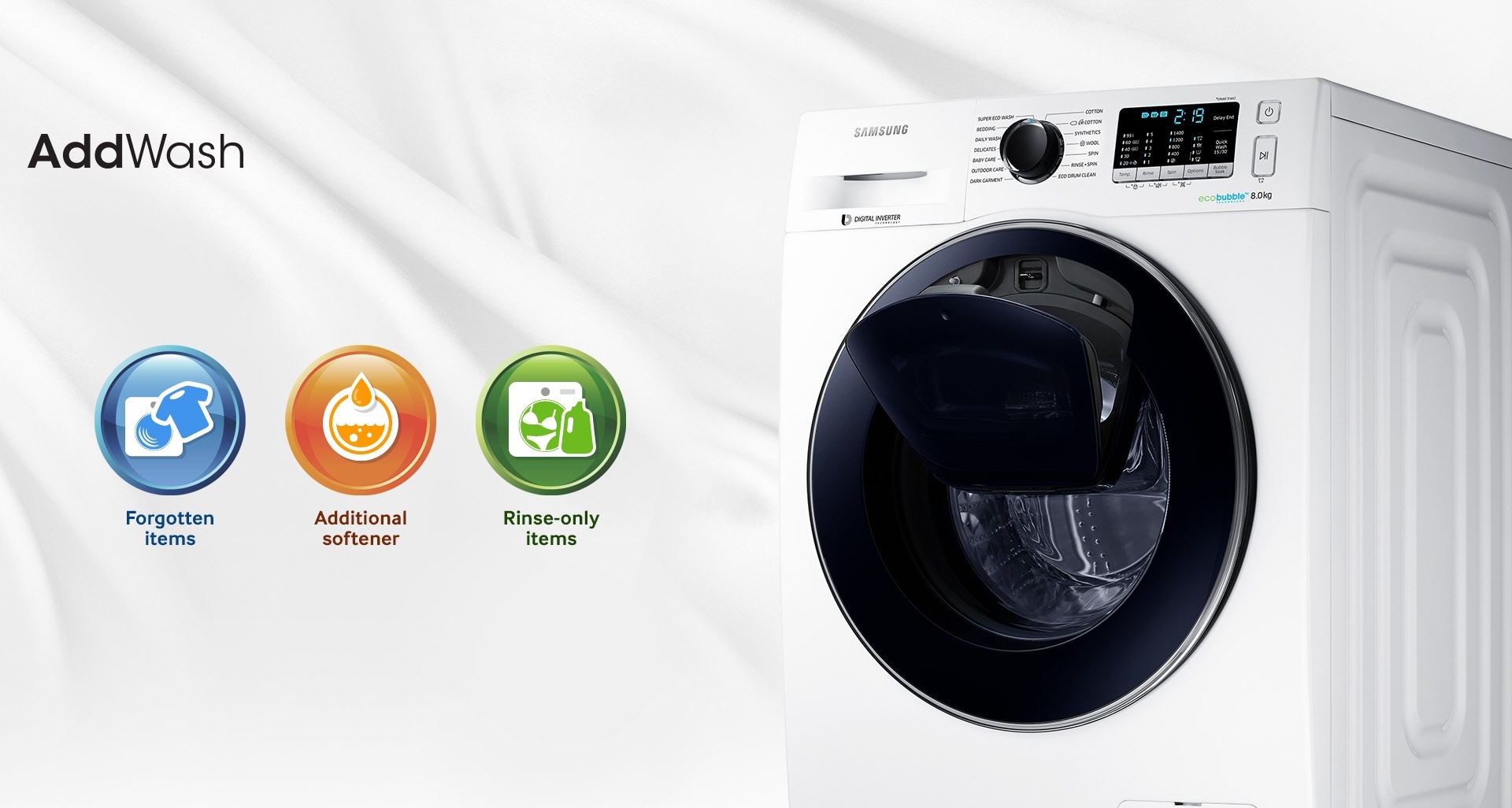 Samsung 8 5kg addwash steam front load washer ww85k54e0uw lets you add forgotten clothing or fabric softener after your wash cycle has started.